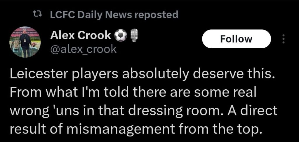 “Leicester players absolutely deserve this. From what I’m told there are some real wrong ‘uns in that dressing room. A direct result of mismanagement from the top.”