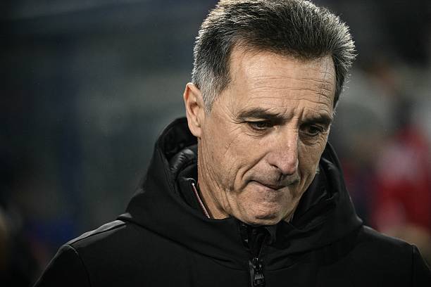 Auxerre’s French head coach Christophe Pelissier looks down during the French L1 football match between AJ Auxerre and Lille LOSC at the Stade de l’Abbe-Deschamps in Auxerre, central France, on December 14, 2025. (Photo by ARNAUD FINISTRE / AFP via Getty Images)