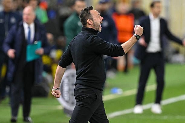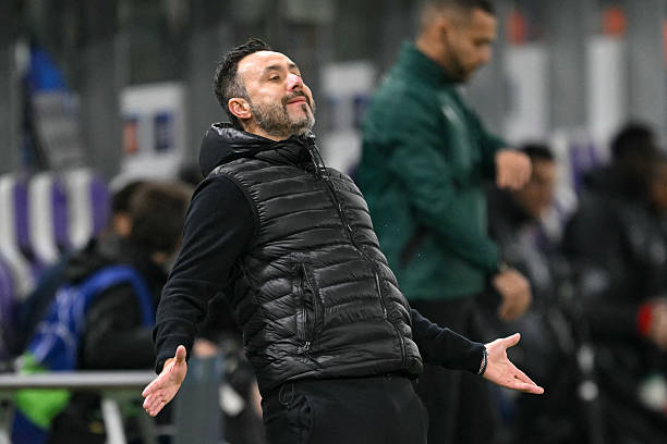 Marseille’s Italian head coach Roberto De Zerbi reacts from the sidelines during the UEFA Champions League, league phase day 6, football match between Royale Union Saint-Gilloise (BEL) and Olympique de Marseille (FRA), at the RSC Anderlecht Stadium in Brussels, on December 9, 2025. (Photo by NICOLAS TUCAT / AFP via Getty Images)