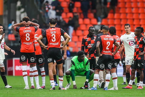 Bingourou KAMARA of Lorient looks dejected with his team-mates after the Ligue 1 McDonald’s match between Lorient and Lille at Stade du Moustoir on August 30, 2025 in Lorient, France. (Photo by Johnny Fidelin/Icon Sport via Getty Images)