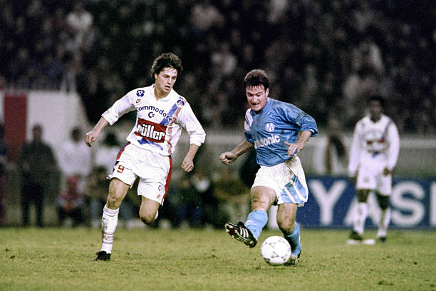 Didier Deschamps (R) kiks the ball, on December 17, 1991 during OM (Olympique de Marseille) match against PSG (Paris Saint Germain), at the Parc des Princes stadium in Paris (Photo credit should read JACQUES DEMARTHON/AFP via Getty Images)