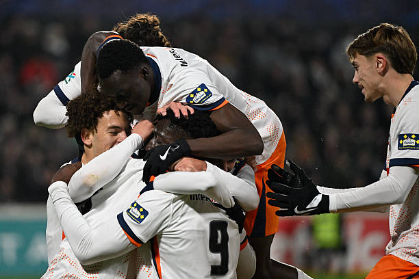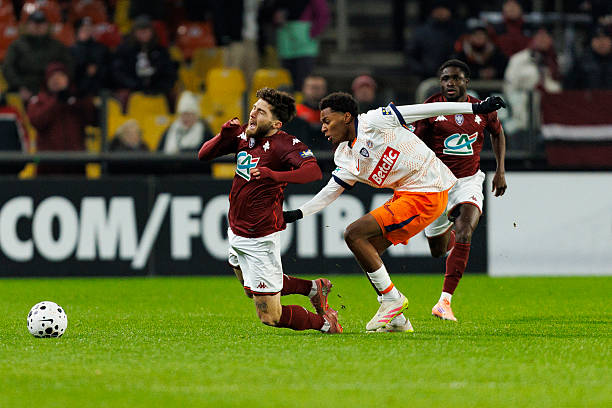 METZ, FRANCE – JANUARY 11: Georgiy Tsitaishvili of FC Metz (L) is challenged by Yanis Issoufou of Montpellier Herault SC (R) during the French Cup match between FC Metz and Montpellier Herault SC at Stade Saint-Symphorien on January 11, 2026 in Metz, France. (Photo by Sathire Kelpa/Eurasia Sport Images/Getty Images)