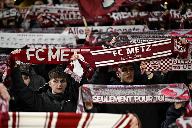 Metz’s supporters waves their club’s scarves during the French Cup round of 32 football match between FC Metz and Montpellier HSC at the Saint-Symphorien stadium in Metz, eastern France on January 11, 2026. (Photo by Jean-Christophe VERHAEGEN / AFP via Getty Images)